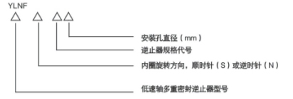 YLNFS10-200表示規格是YLNF10型,從軸端方向看,內圈順時針方向旋轉,安裝孔直徑d為200mm的低速軸多重密封逆止器。